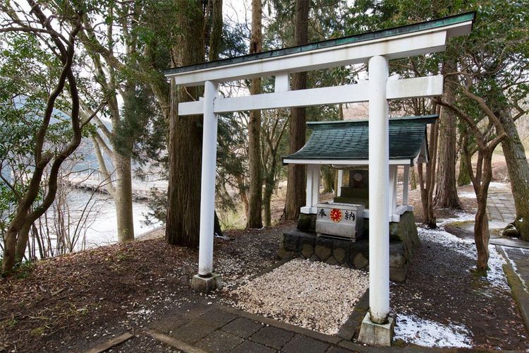 「白龍神社」は、九頭龍神社と縁が深い白龍を祀る小さな神社で、商売繁盛や心願成就のご利益があるとされています。静かな湖畔の森の中に佇む、珍しい白い鳥居と御社殿が印象的で、SNSで話題も高まり、近年注目度がアップしています。九頭龍神社の朱色の鳥居と、この白い鳥居にかけて九頭龍神社と白龍神社の2社を巡ることを「紅白参り」と呼ばれ、人気の楽しみ方のひとつとなっています。