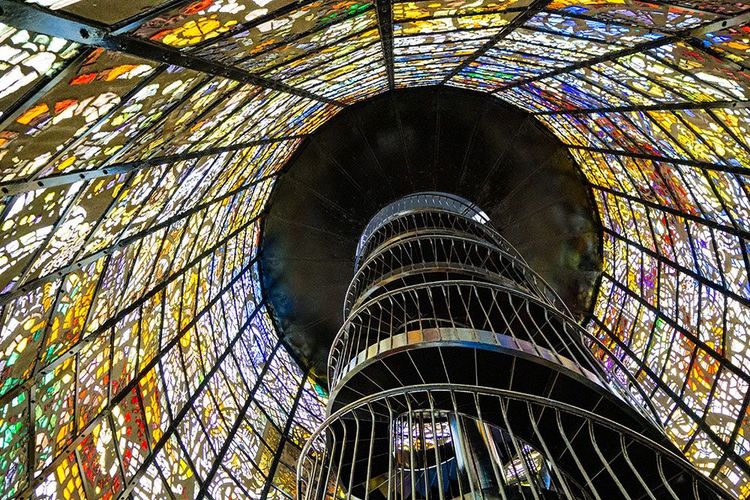 中でも「幸せを呼ぶシンフォニー彫刻」が人気で、高さ18m、内径8mの塔の内壁が一面ステンドグラスで彩られ、自然光が差し込むと幻想的な輝きを放ちます。中央のらせん階段を上ると、まるで光に包まれるような特別な体験ができます。