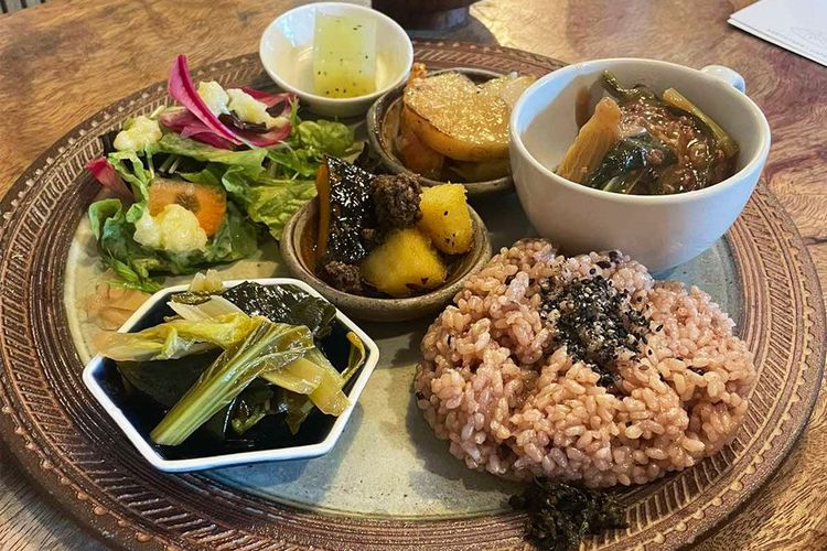 鴨川の街に溶け込むように佇む「earth tree cafe」は、素朴で温もりのある空間と、体にやさしい料理が魅力の自然派カフェ。鴨川の生産者が育てた無農薬野菜や玄米、自家製の天然酵母パンなど、自然の恵みをたっぷり使った料理を提供しています。看板メニューの日替わり雑穀プレートは、玄米や雑穀のおかず、お味噌汁に惣菜がついた満足感のある一皿。スパイスが効いた「ジャークチキン」も人気のメニューです。
