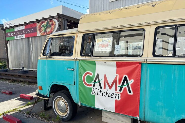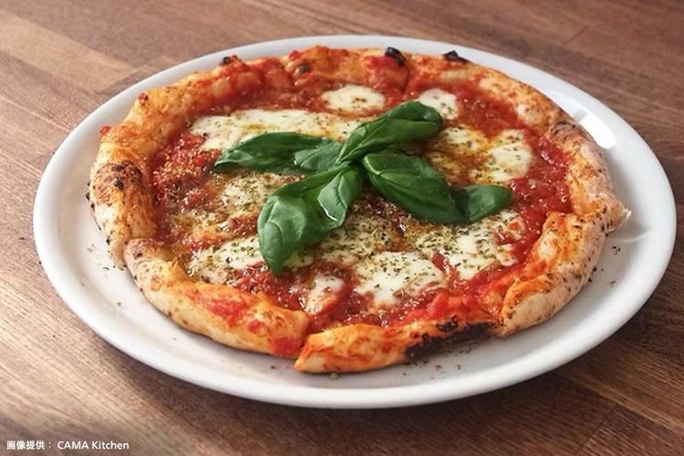 前原海岸のすぐ近くにある「CAMA Kitchen」は、窯焼きピザと創作料理を楽しめるカジュアルリゾートのようなおしゃれな雰囲気のレストランです。特に人気なのが、ナポリピザの定番「CAMAゲリータ」や、鴨川産の無農薬ハーブを使った「鴨川産 無農薬ハーブの楽園ピザ」。生地は毎日店内で手作りされ、香り豊かな焼きたてが楽しめます。